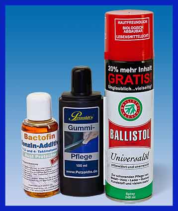 Drei Produkte die ein stillgelegtes oder wenig bewegtes Fahrzeug für den Winter benötigt: Bactofin, Universalöl und eine tiefwirkende Gummipflege.