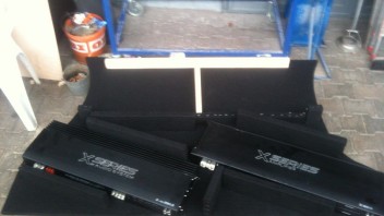 Hier schonmal testweise im Kofferraum. Alles mal hingestellt, Löcher für Kabel gebohrt, aber noch nichts verkabelt.